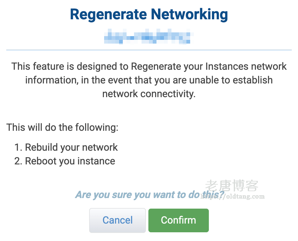 可以看到如下提示,意思是这个功能会重新生成这台 VPS 的网络信息,当你连不上 VPS 的时候可以尝试。