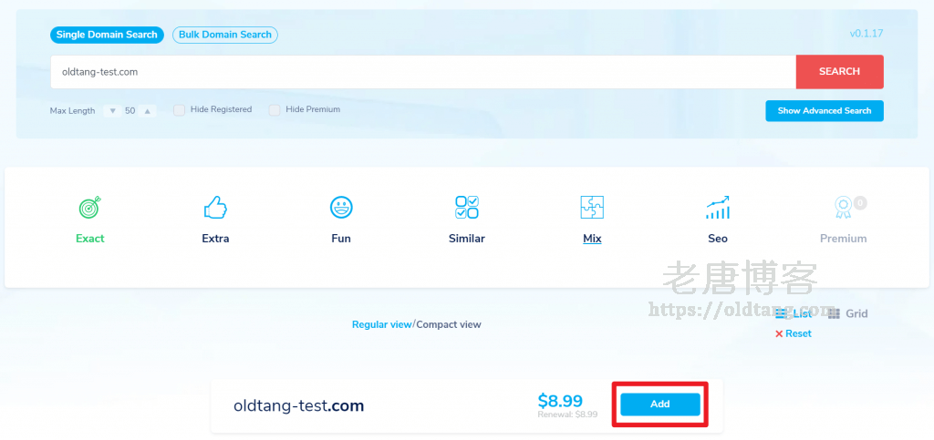 然后点击 Search 就可以开始搜索。搜索之后,如果可以注册,那么就点击 Add 加入购物车,并在此之后点击 Checkout 进行结算。如果发现域名已经被注册,那么就可以换个后缀或者是换个前缀都可以,然后重新搜索。