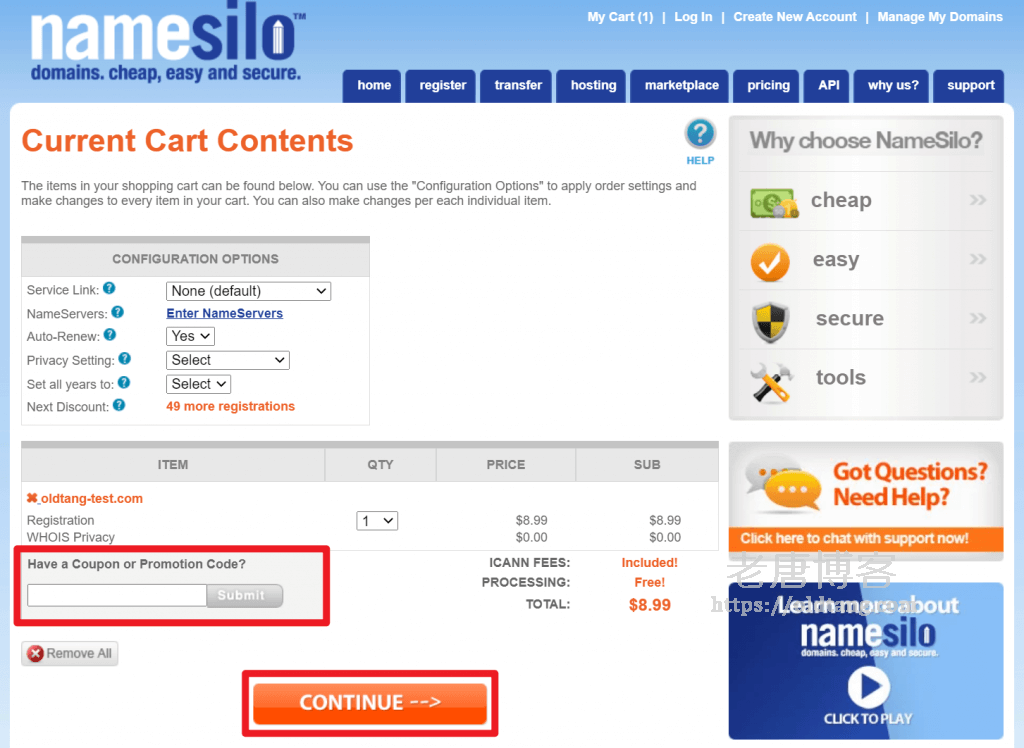 之后我们需要输入 NameSilo 优惠码,目前老唐搜集了下面几个优惠码,如果我们之前从未用过优惠码,就可以使用这些优惠码获取优惠。