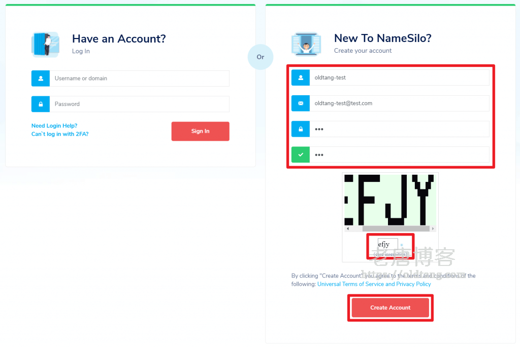 下面就该注册账户了。如果我们是老用户,直接登录即可。如果我们是新用户,在右边的 New To NameSilo 那里填写必要信息进行注册账户,要填写的信息如下:
