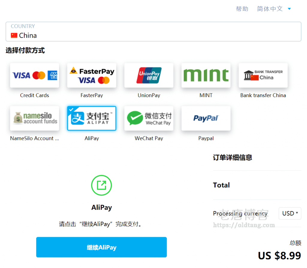 最后,就是进行付款了。在付款界面,我们可以看到多种付款方式可供选择,包括我们非常熟悉的支付宝、微信支付、银联支付(UnionPay),此外还有银行转账(Bank transfer China),以及信用卡(Credit Cards)、PayPal 也是使用比较多的,其他的方式一般我们比较少用到。
