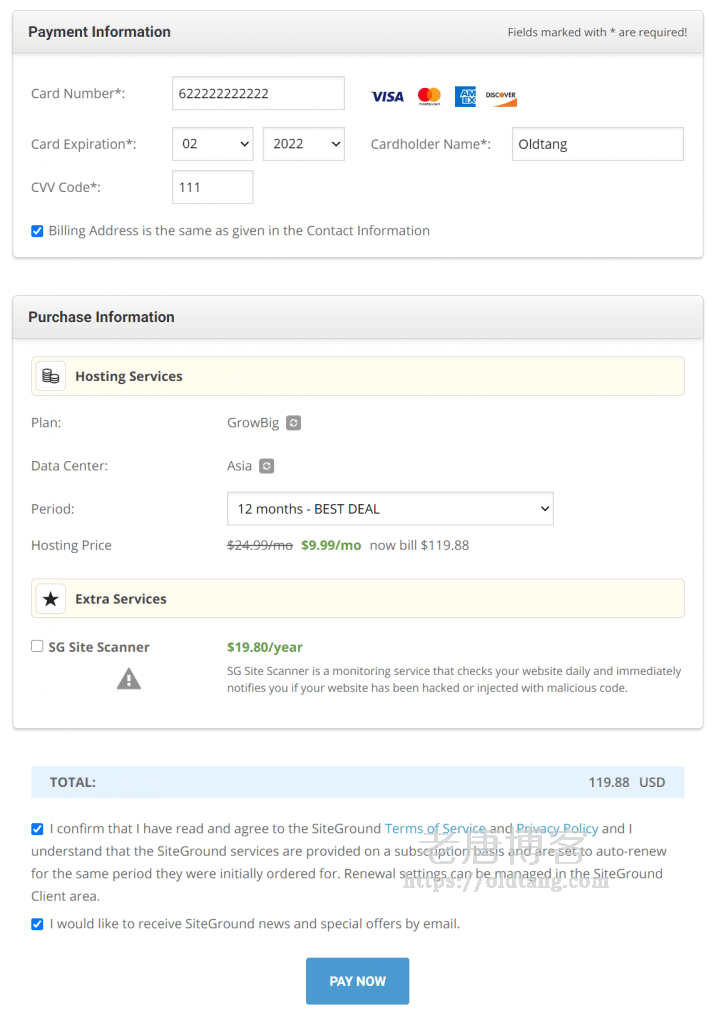 如果没什么问题,勾选下面的复选框,然后点击 PAY NOW 就可以付款了。