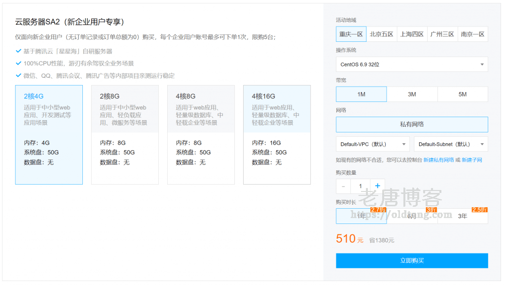 新企业用户的优惠力度一般都是最大的,如图所示,新企业用户专享云服务器,最低仅需 510 元一年,买三年更是低至 2.5 折。(点击参与活动)