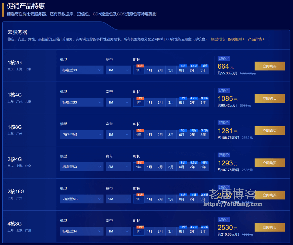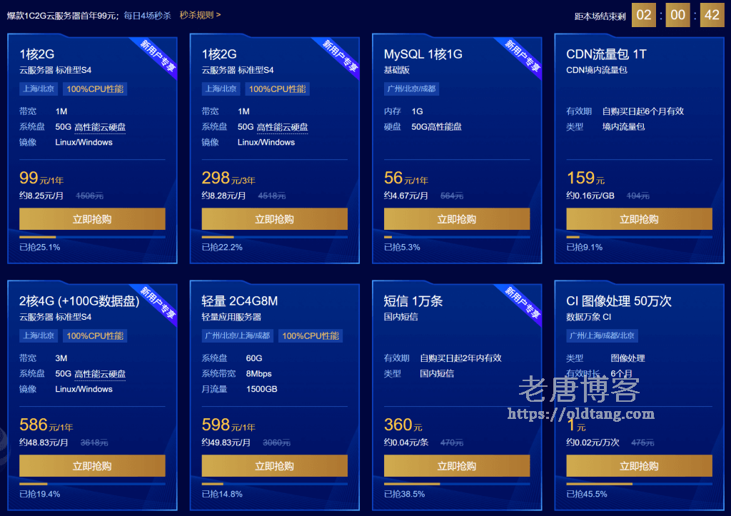如下所示是目前最热门的几个秒杀方案,包括标题提到的 1核 2G 云服务器仅需 99 元/年,此外,购买三年也仅需 298 元。(点击前往购买)