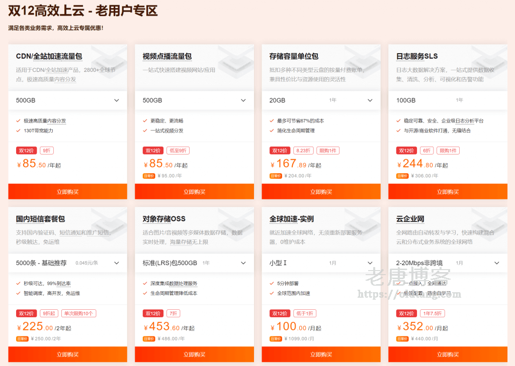阿里云老用户专区包括 CDN 全站加速流量包、视频点播流量包、存储容量单位包、日志服务 SLS、国内短信套餐包、对象存储 OSS、全球加速、云企业网等多种产品都在参加活动,并且看折扣力度是非常大的。