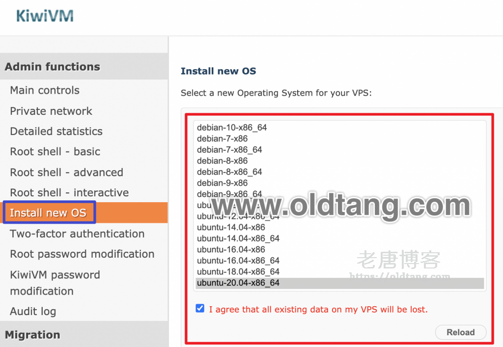 第二步,点击左侧的 Install new OS,然后选择对应的操作系统。这里老唐选择的是 ubuntu-20.04-x86_64,因为算是最新的 Ubuntu 发行版了,各方面都很好用。大家选择自己想要安装的系统就行。