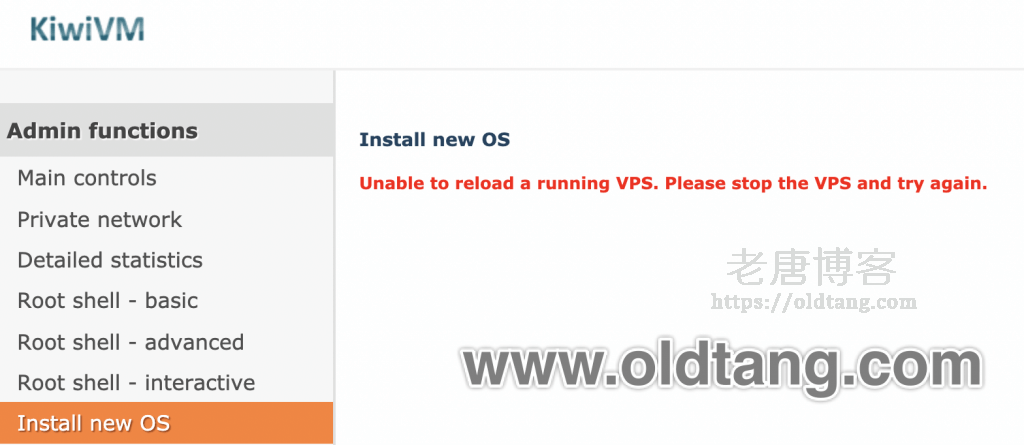 这时候我们只需要重新返回 KiwiVM 首页按照上面的方法把 VPS 关了就行,关机之后再重新尝试重装系统即可。