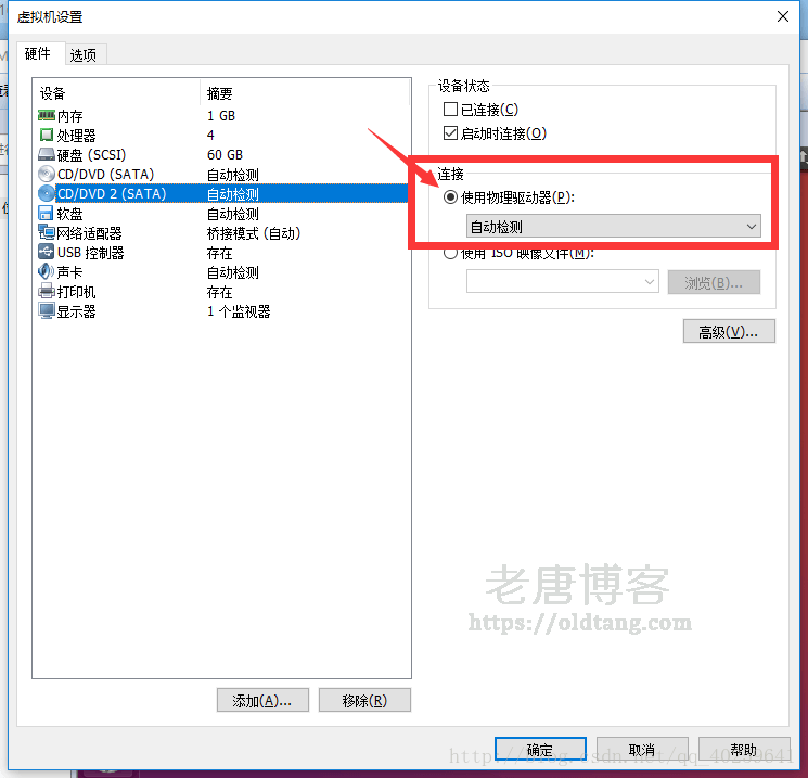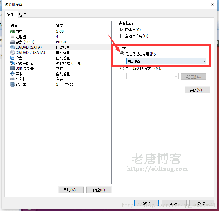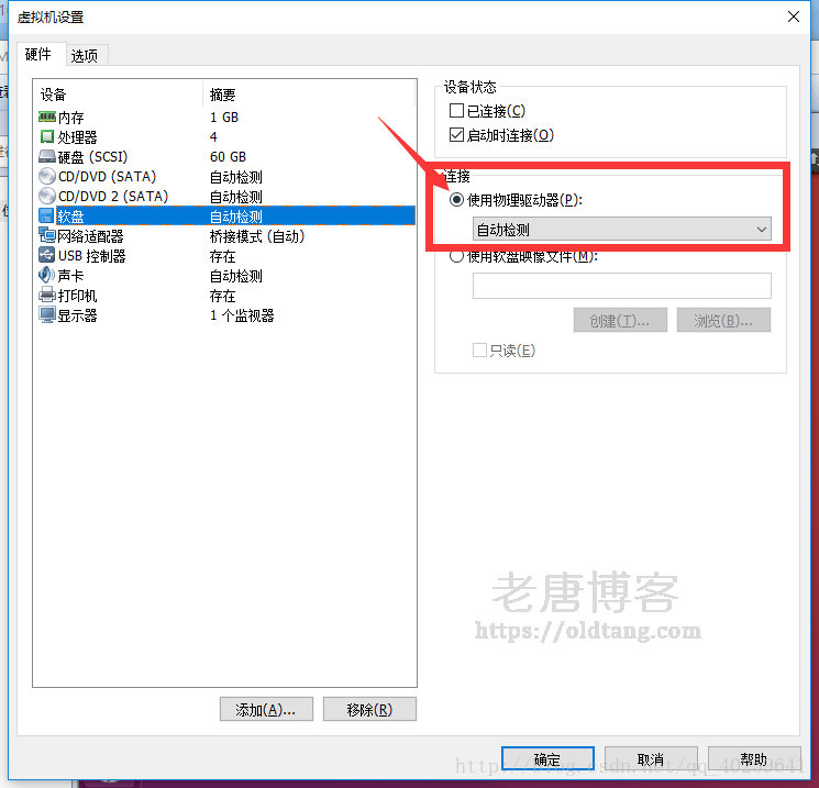 - 在虚拟机设置分别设置 CD/DVD、CD/DVD2 和软盘为自动检测三个步骤;