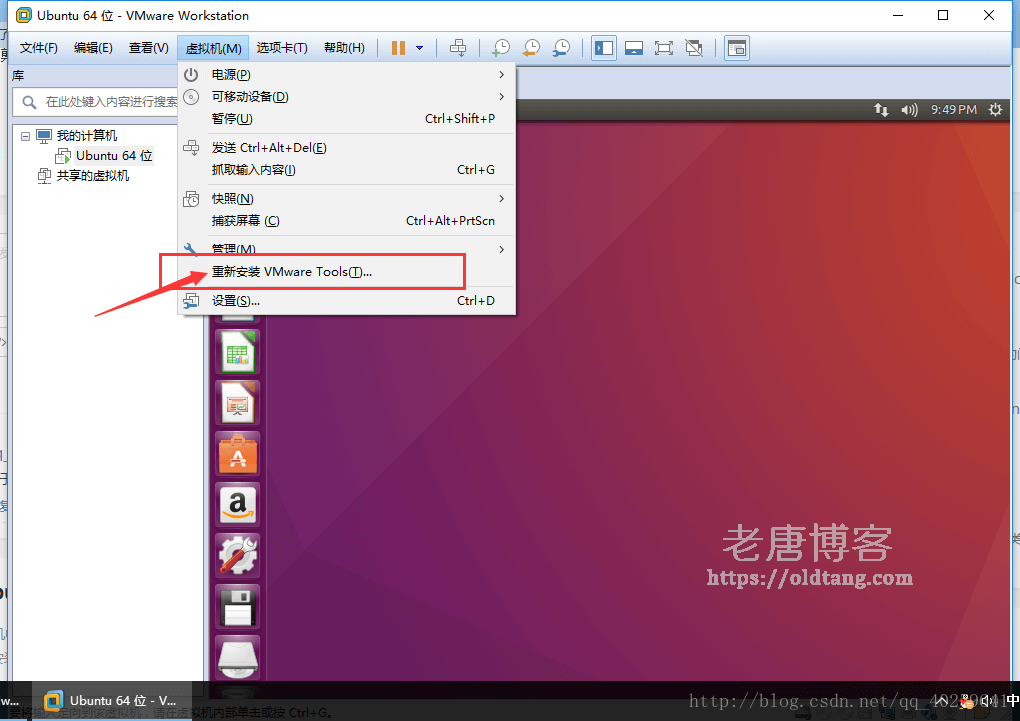 2、在 VMware 导航栏找到:虚拟机——安装 VMware tools,点击