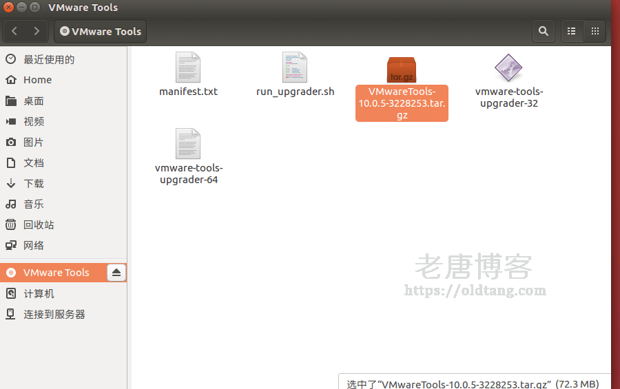 3、虚拟机会发现多了一个 CD 镜像—— VMware Tools,打开后将 VMwareTools-10.0.5-3228253.tar.gz 解压到一个本地,解压后效果: