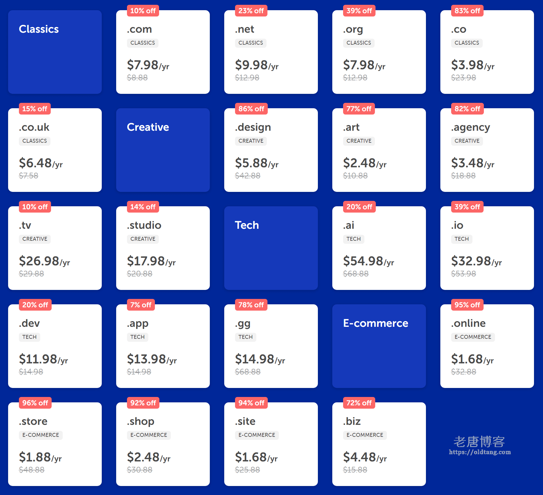 NameCheap 在域名界是一把好手,最喜欢搞促销,也是最真诚的搞促销的一个商家。每年黑五,其实只需要关注 NameCheap 的促销就行了,其他商家也都没什么意思。NameCheap 今天看到再次带来了新年促销,域名低至 0.4 折,四舍五入不要钱啊。NameCheap 也是老唐使用了很久的一个商家,当年用是因为便宜,现在用大概是因为情怀,因为目前老唐已经是 Dynadot 的 bulk Price,比 NameCheap 的价格还便宜一些。虽然老唐目前在 NameCheap 也是享受大客户价格,不过还是比 Dynadot 贵一些。