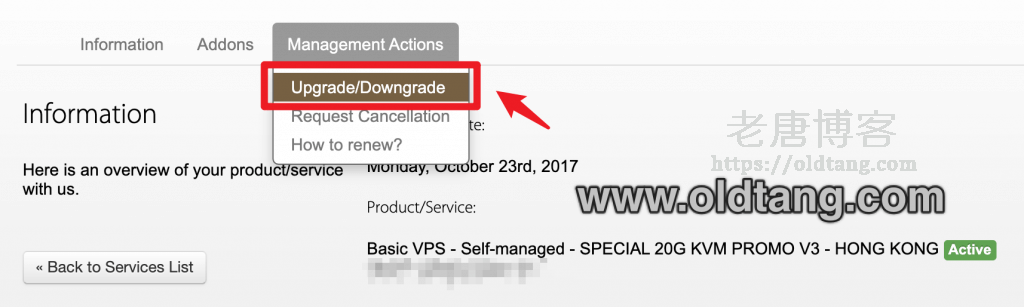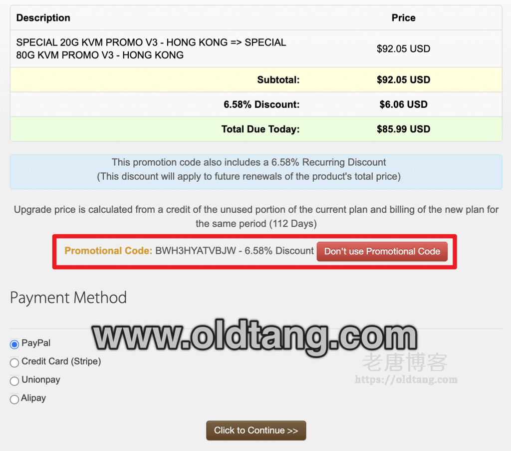 昨天纠结了很久,还是没有升级搬瓦工的香港套餐,不过倒是发现升级的时候居然可以使用优惠码了,并且还可以更换优惠码,简直就是福音。我们岂不是可以越升级折扣越大,这么一想还是挺划算的。本文简单记录一下搬瓦工后台自助升级套餐的教程,非常方便。但是目前如果需要降级是需要联系客服来确定能不能降级的,不能自助降级。