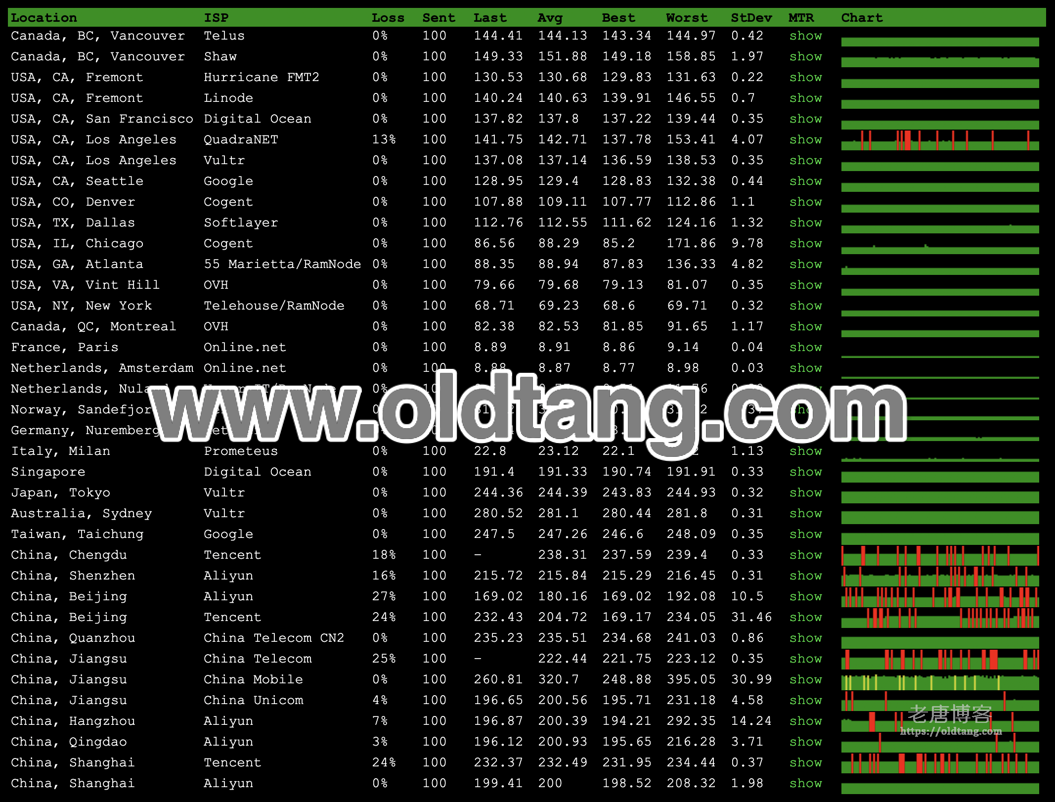 | 北美洲 | 美国纽瓦克(linode) 68.2ms/加拿大温哥华(cogentco.com) 174.2ms | 112.4ms |