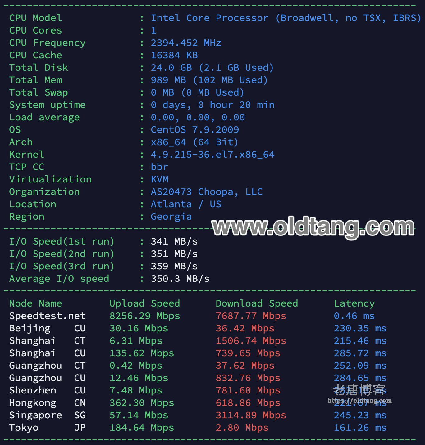 下面测试结果分为未启用 BBR 的测速结果和启用 BBR 的测速结果。因为这次装了 CentOS,装完发现默认没有启用 BBR,所以就装上 BBR 又测试了一次。