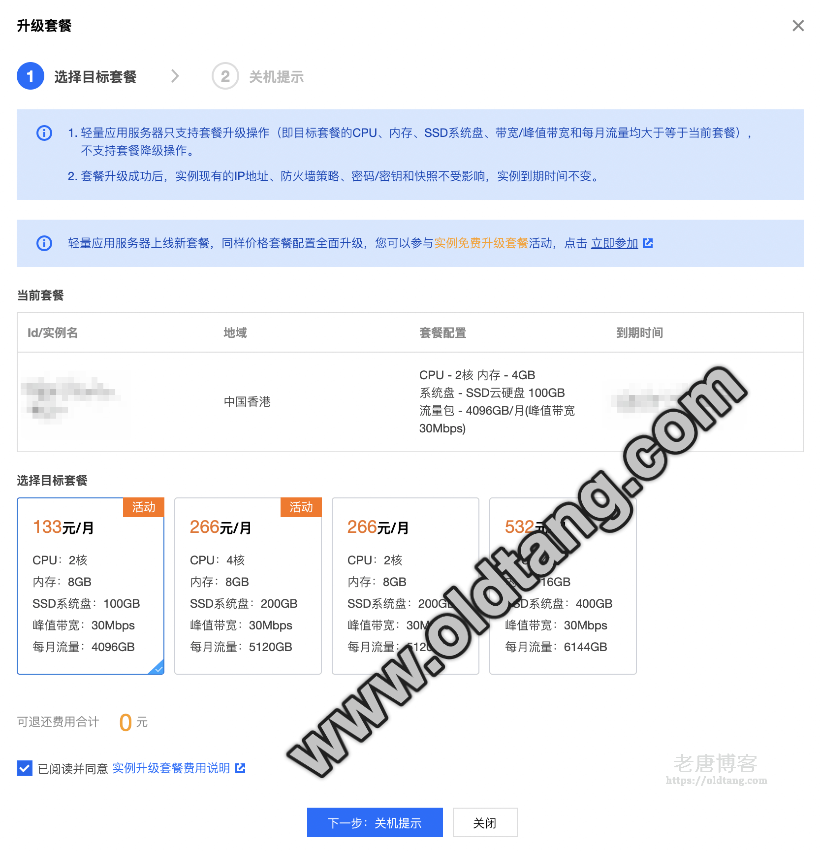 如图所示,可以看到这次是中国大陆地区的套餐升级的配置比较厉害,老唐手里的一台 1 核 2G 40G 5M 1000G 的轻量,这次直接配置给翻倍了,这感觉,爽!