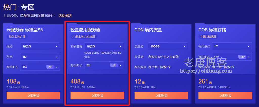 首先我们需要购买原版的轻量应用服务器套餐,目前我们可以前往下面两个页面购买,任选其一即可。因为购买之后续费是原价,所以如果想用的时间长一点就买个三年,否则也可以买一年。