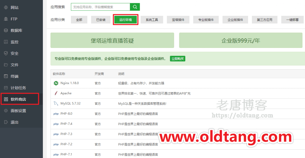 如果我们没有自行弹出上面的选择 LNMP 和 LAMP 的界面,也可以在软件商店里选择对应的软件进行安装,如图所示: