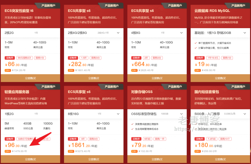进入活动页面之后,可以看看下方的几款优惠方案,推荐的是第一款 ECS 突发性能型 t6 和轻量应用服务器,分别是 86 元/年和 96 元/年,并且都可以续费三年,也就是一共可以购买四年。