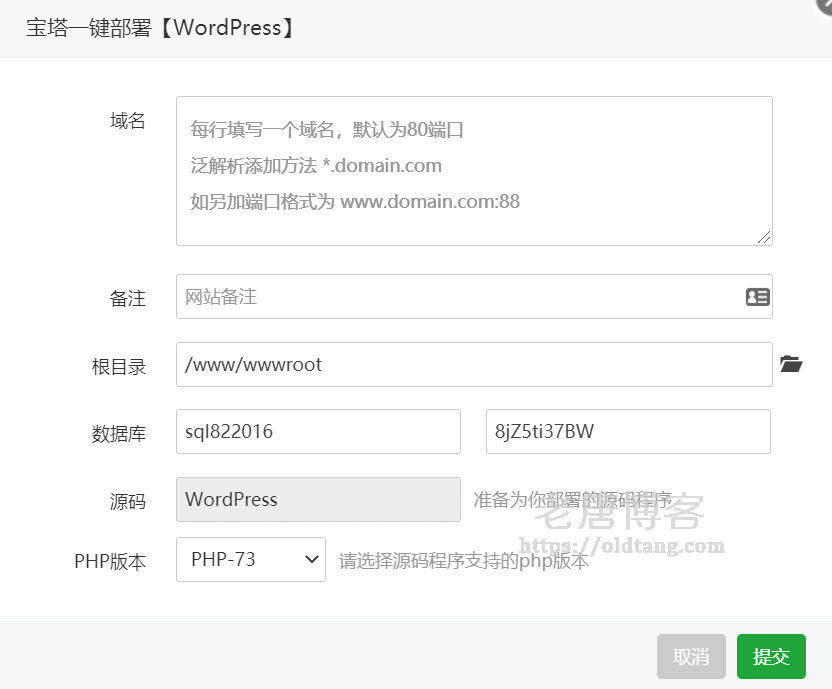 之后会弹出一个配置框,需要输入域名、数据库等信息。