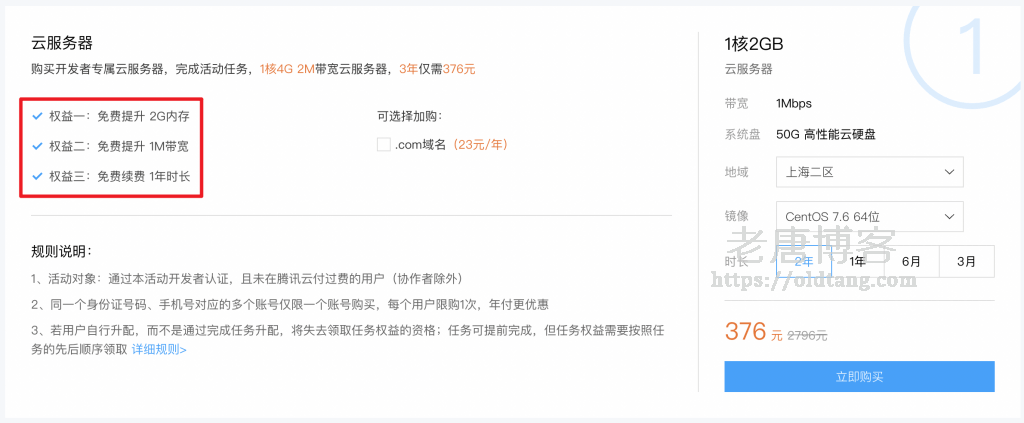 腾讯云开发者优惠套餐,跟阿里云的差不多,也是开发者认证一下然后就可以买的。看了看力度,配置比阿里云的高一些,最多可以购买三年,续费好像会恢复原价。阿里云是可以购买一年 + 续费三年所以一共是四年。这两者如何取舍就看大家怎么选择了。购买的时候只有 1核2G1M,购买之后可以参加活动免费升级。