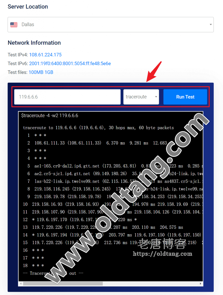 LookingGlass 使用起来也很简单,打开上面表格中的 LookingGlass 地址,然后输入要测试的 IP 地址,选择 traceroute,如下图所示,点击 Run Test,就可以开始测试了。