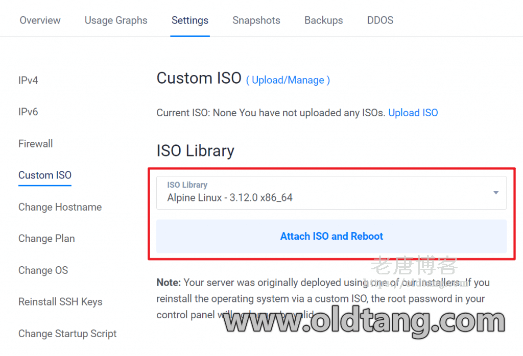 进入 Vultr 官网之后,在 VPS 管理后台,点击对应的 VPS,然后点击 Settings,可以看到有一个 Custom ISO,如图所示。