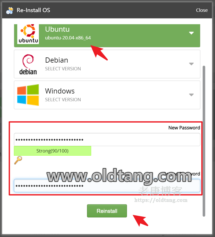 如图所示,选择想要重装的系统版本,我这里选择的是 ubuntu-20.04-x86_64,然后输入一个密码,开始安装。