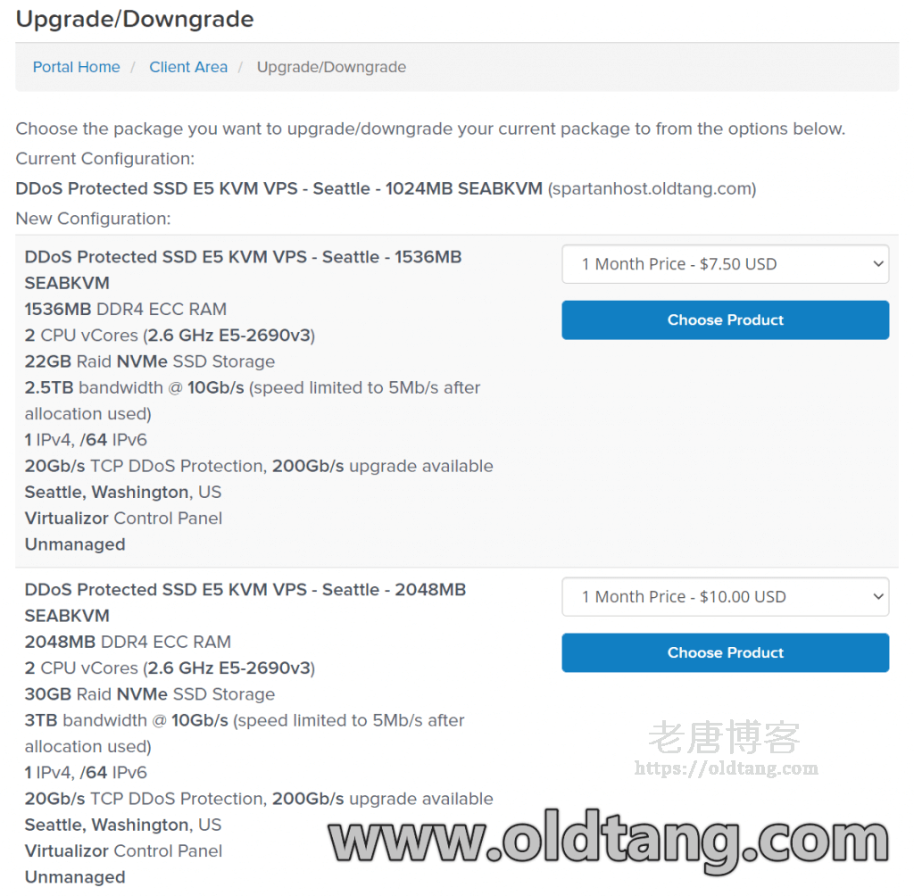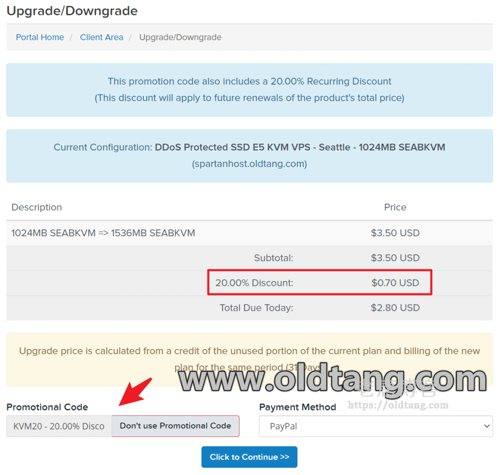 SpartanHost 如果购买之后觉得配置不够用,是可以在官网后台一键升级套餐配置的。这点应该大多数 VPS 都支持吧,还是很方便的。不过如果需要降级,可能就需要联系客服了。目前老唐购买的这台 SpartanHost 配置上来看是够用了,不过看到了升级的选项,在此分享一下。升级的时候还是可以继续使用优惠码获取优惠的,目前是八折优惠。