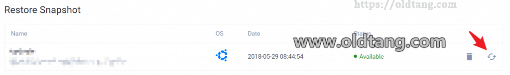 创建快照简单,恢复快照也简单。在同一个页面上,有一个 Restore Snapshot,然后看到有一个图标,点击一下就可以恢复快照了,如下图所示。