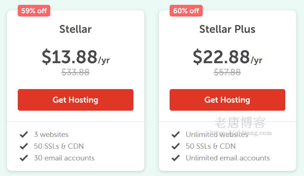 第三是普通的虚拟主机优惠,可以看到无限网站数量的虚拟主机一年也才 $22.88 美元。