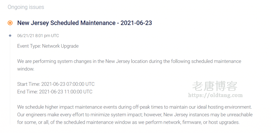 然后就可以看到有一个维护通知,如图所示,就是告知预计时间内会有一个系统维护,大家可以根据这些通知或者是状态判断是不是 Vultr 机房的问题。