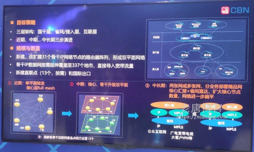 未来,CBNNET 将采用三层架构,即国干层、省网 / 接入层、互联层,覆盖 337 个地市,逐步形成双平面网络,直接提供宽带出口,互联网总出口带宽将达到 5T。