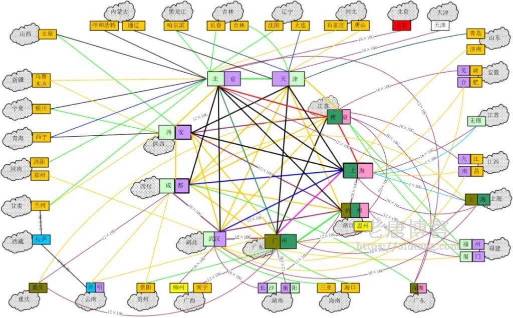 北京、上海、广州,是 ChinaNet 的超级核心。除了超级核心之外,ChinaNet 还有天津、西安、南京、杭州、武汉、成都等普通核心。所有核心之间,采用 Full-Mesh 连接。国际出入口,以及运营商之间的互联互通,基本上都在核心层。