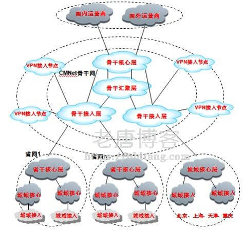 CMNET 为骨干网和省网两级自治域、多层结构。骨干网分为核心层、汇聚层和接入层。