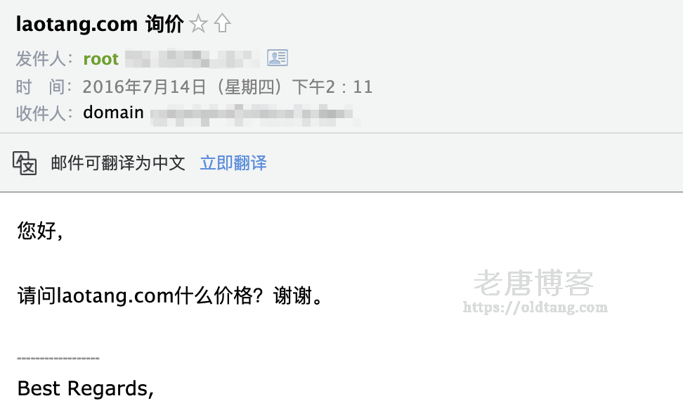 说来也是巧合,因为一直有逛域名交易网站的爱好,然后前天又习惯性的去阿里云的域名交易看了看,发现 7 月 24 日的时候 laotang.com 上架出售,一口价。看了看价格在自己可以接受的范围内,花了 1 分钟时间思考了一下,然后果断付款买下了。