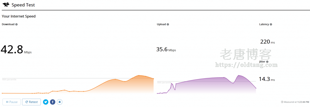 打开后会自动开始测速,结果如下图所示。可以看到清晰的展示了下载速度和上传速度,以及延迟、抖动等信息。