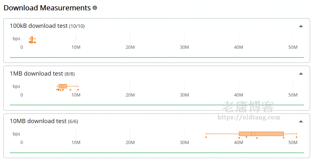 如果我们点击对应的结果,还可以查看到详细的信息。比如下面的下载速度测试结果,有详细的最小值、最大值、平均值、中间数等信息。