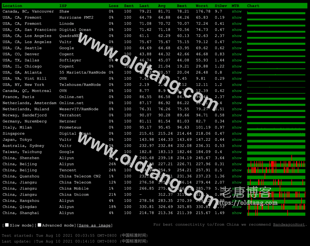 | 线路 | 最快节点 | 最慢节点 | 平均响应 |