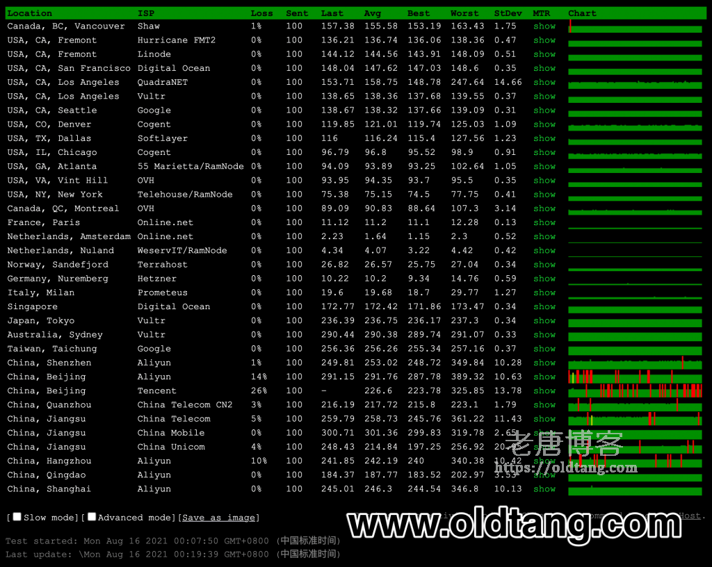 下面是更多的 Vultr 荷兰机房的速度测试结果,联通和移动线路速度还可以。