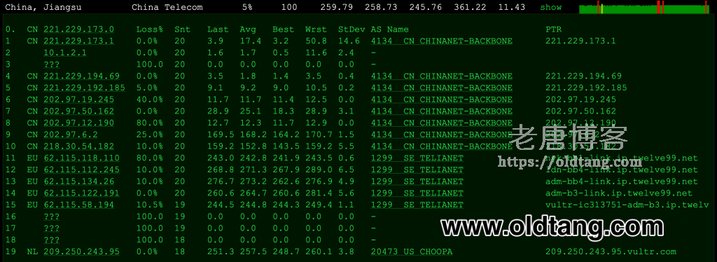 ---------------------------------------------------------------------- 广州电信 traceroute to 14.215.116.1 (14.215.116.1), 30 hops max, 32 byte packets 1 * 2 * 3 * 4 * 5 ae0-1452.cr4-ams2.ip4.gtt.net (154.14.36.77) 23.52 ms AS286,AS3257 Netherlands, North Holland, Amsterdam, interoute.com 6 ae15.cr6-ams1.ip4.gtt.net (213.200.117.58) 1.81 ms AS286,AS3257 Netherlands, North Holland, Amsterdam, gtt.net 7 81.173.18.33 1.76 ms AS4134 Europe Regions, cteurope.net 8 202.97.70.217 256.92 ms * China, Guangdong, Guangzhou, ChinaTelecom 9 202.97.94.113 248.44 ms AS4134 China, Guangdong, Guangzhou, ChinaTelecom 10 202.97.89.217 256.51 ms AS4134 China, Guangdong, Guangzhou, ChinaTelecom 11 113.96.5.70 269.75 ms AS58466 China, Guangdong, Guangzhou, ChinaTelecom 12 183.2.145.202 261.03 ms AS58466 China, Guangdong, Guangzhou, ChinaTelecom 13 183.56.129.10 266.10 ms AS58466 China, Guangdong, Guangzhou, ChinaTelecom 14 14.215.116.1 276.07 ms AS58466 China, Guangdong, Guangzhou, ChinaTelecom ---------------------------------------------------------------------- 上海电信 traceroute to 101.95.120.109 (101.95.120.109), 30 hops max, 32 byte packets 1 * 2 * 3 * 4 * 5 ae0-1452.cr4-ams2.ip4.gtt.net (154.14.36.77) 5.02 ms AS286,AS3257 Netherlands, North Holland, Amsterdam, interoute.com 6 ae11.cr6-ams1.ip4.gtt.net (213.200.117.178) 3.48 ms AS286,AS3257 Netherlands, North Holland, Amsterdam, gtt.net 7 81.173.18.33 15.05 ms AS4134 Europe Regions, cteurope.net 8 * 9 * 10 202.97.57.146 244.21 ms AS4134 China, Shanghai, ChinaTelecom 11 * 12 * 13 101.95.120.109 254.09 ms AS4812 China, Shanghai, ChinaTelecom ---------------------------------------------------------------------- 厦门电信 traceroute to 117.28.254.129 (117.28.254.129), 30 hops max, 32 byte packets 1 * 2 * 3 * 4 * 5 adm-b3-link.ip.twelve99.net (62.115.58.193) 16.29 ms AS1299 Netherlands, North Holland, Amsterdam, telia.com 6 adm-bb3-link.ip.twelve99.net (62.115.122.178) 7.78 ms AS1299 Netherlands, North Holland, Amsterdam, telia.com 7 ldn-bb1-link.ip.twelve99.net (213.155.136.98) 7.85 ms AS1299 United Kingdom, London, telia.com 8 ldn-b2-link.ip.twelve99.net (62.115.122.189) 7.72 ms AS1299 United Kingdom, London, telia.com 9 chinatelecom-ic335972-ldn-b2.ip.twelve99-cust.net (80.239.193.226) 7.61 ms AS1299 United Kingdom, London, telia.com 10 59.43.187.185 190.54 ms * China, Shanghai, ChinaTelecom 11 59.43.246.213 210.48 ms * China, Shanghai, ChinaTelecom 12 59.43.130.205 197.44 ms * China, Shanghai, ChinaTelecom 13 59.43.138.186 201.38 ms * China, Fujian, ChinaTelecom 14 110.80.128.82 251.89 ms AS133775 China, Fujian, Xiamen, ChinaTelecom 15 27.159.81.206 270.92 ms AS133775 China, Fujian, Xiamen, ChinaTelecom 16 117.25.141.106 262.91 ms AS133775 China, Fujian, Xiamen, ChinaTelecom 17 117.28.254.129 198.41 ms AS4809 China, Fujian, Xiamen, ChinaTelecom ----------------------------------------------------------------------