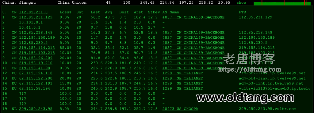 ---------------------------------------------------------------------- 重庆联通 traceroute to 113.207.25.138 (113.207.25.138), 30 hops max, 32 byte packets 1 * 2 * 3 * 4 * 5 ae0-1452.cr4-ams2.ip4.gtt.net (154.14.36.77) 1.37 ms AS286,AS3257 Netherlands, North Holland, Amsterdam, interoute.com 6 ae17.cr11-lon2.ip4.gtt.net (89.149.140.253) 16.33 ms AS286,AS3257 United Kingdom, London, gtt.net 7 195.94.47.2 181.03 ms AS286,AS3257 United Kingdom, London, interoute.com 8 219.158.97.197 182.64 ms AS4837 China, Beijing, ChinaUnicom 9 219.158.3.133 174.84 ms AS4837 China, Beijing, ChinaUnicom 10 * 11 219.158.101.106 251.97 ms AS4837 China, Chongqing, ChinaUnicom 12 113.207.25.138 242.99 ms AS4837 China, Chongqing, ChinaUnicom ---------------------------------------------------------------------- 成都联通 traceroute to 119.6.6.6 (119.6.6.6), 30 hops max, 32 byte packets 1 * 2 * 3 * 4 * 5 adm-b3-link.ip.twelve99.net (62.115.58.193) 0.32 ms AS1299 Netherlands, North Holland, Amsterdam, telia.com 6 adm-bb3-link.ip.twelve99.net (62.115.122.178) 8.60 ms AS1299 Netherlands, North Holland, Amsterdam, telia.com 7 ffm-bb1-link.ip.twelve99.net (62.115.120.241) 20.14 ms AS1299 Germany, Hesse, Frankfurt, telia.com 8 ffm-b2-link.ip.twelve99.net (62.115.142.205) 8.24 ms AS1299 Germany, Hesse, Frankfurt, telia.com 9 * 10 219.158.12.173 170.94 ms AS4837 China, Guangdong, Guangzhou, ChinaUnicom 11 219.158.3.145 168.80 ms AS4837 China, Beijing, ChinaUnicom 12 * 13 219.158.110.202 195.21 ms AS4837 China, Sichuan, Chengdu, ChinaUnicom 14 119.6.197.150 184.93 ms AS4837 China, Sichuan, Chengdu, ChinaUnicom 15 119.7.220.218 192.99 ms AS4837 China, Sichuan, Chengdu, ChinaUnicom 16 119.6.6.6 189.02 ms AS4837 China, Sichuan, Chengdu, ChinaUnicom ----------------------------------------------------------------------