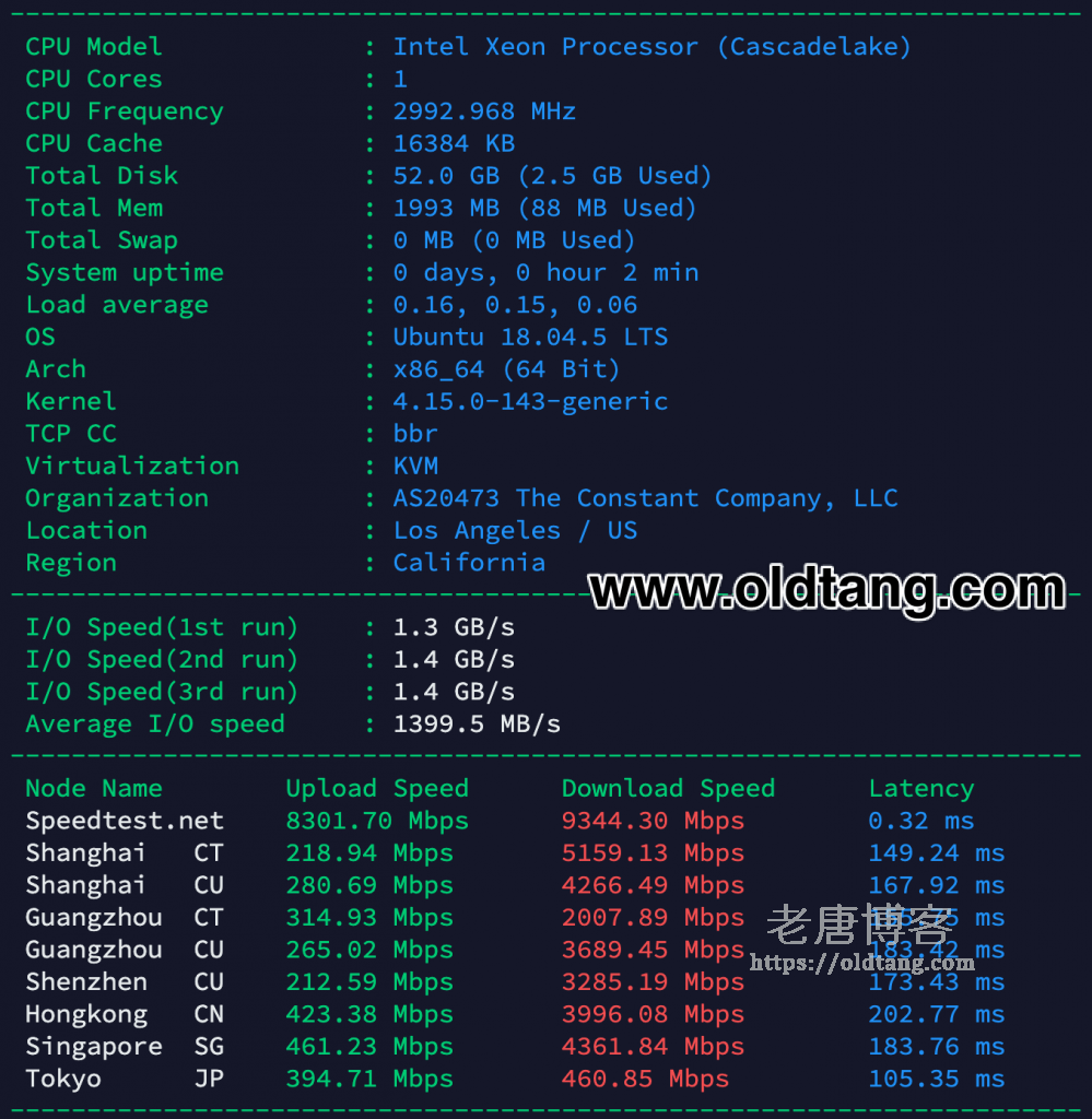 下面是 Vultr 洛杉矶机房总体情况,硬盘读写速度非常快,下载速度也不错。