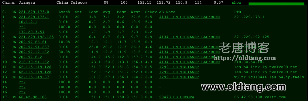 ---------------------------------------------------------------------- 广州电信 traceroute to 14.215.116.1 (14.215.116.1), 30 hops max, 32 byte packets 1 * 2 * 3 * 4 * 5 * 6 et-0-0-61.cr3-lax2.ip4.gtt.net (76.74.41.89) 1.11 ms AS286,AS3257 United States, California, Los Angeles, gtt.net 7 202.97.49.137 165.39 ms AS4134 China, Guangdong, Guangzhou, ChinaTelecom 8 * 9 * 10 113.96.4.70 191.78 ms AS58466 China, Guangdong, Guangzhou, ChinaTelecom 11 113.96.4.70 251.31 ms AS58466 China, Guangdong, Guangzhou, ChinaTelecom 12 113.96.4.226 170.72 ms AS58466 China, Guangdong, Guangzhou, ChinaTelecom 13 183.2.145.218 165.48 ms AS58466 China, Guangdong, Guangzhou, ChinaTelecom 14 183.56.128.10 165.52 ms AS58466 China, Guangdong, Guangzhou, ChinaTelecom 15 14.215.116.1 165.97 ms AS58466 China, Guangdong, Guangzhou, ChinaTelecom ---------------------------------------------------------------------- 上海电信 traceroute to 101.95.120.109 (101.95.120.109), 30 hops max, 32 byte packets 1 * 2 * 3 * 4 * 5 et-0-0-61.cr3-lax2.ip4.gtt.net (76.74.41.89) 0.38 ms AS286,AS3257 United States, California, Los Angeles, gtt.net 6 218.30.54.72 1.19 ms AS4134 United States, California, Los Angeles, ChinaTelecom 7 202.97.42.165 131.74 ms AS4134 China, Shanghai, ChinaTelecom 8 202.97.12.209 140.57 ms AS4134 China, Shanghai, ChinaTelecom 9 202.97.57.158 133.53 ms AS4134 China, Shanghai, ChinaTelecom 10 * 11 101.95.120.109 142.97 ms AS4812 China, Shanghai, ChinaTelecom ---------------------------------------------------------------------- 厦门电信 traceroute to 117.28.254.129 (117.28.254.129), 30 hops max, 32 byte packets 1 * 2 * 3 * 4 * 5 las-b4-link.ip.twelve99.net (62.115.149.36) 0.35 ms AS1299 United States, California, Los Angeles, telia.com 6 las-b2-link.ip.twelve99.net (62.115.125.163) 0.51 ms AS1299 United States, California, Los Angeles, telia.com 7 ae-12.r31.tokyjp05.jp.bb.gin.ntt.net (129.250.3.192) 109.88 ms AS2914 Japan, Tokyo, ntt.com 8 ae-3.r00.tokyjp08.jp.bb.gin.ntt.net (129.250.6.129) 103.76 ms AS2914 Japan, Tokyo, ntt.com 9 ae-1.a01.tokyjp03.jp.bb.gin.ntt.net (129.250.2.250) 108.34 ms AS2914 Japan, Tokyo, ntt.com 10 xe-0-0-29-0.a01.tokyjp03.jp.ce.gin.ntt.net (117.103.177.106) 107.73 ms AS2914 Japan, Tokyo, ntt.com 11 59.43.130.209 140.33 ms * China, Shanghai, ChinaTelecom 12 59.43.138.186 160.75 ms * China, Fujian, ChinaTelecom 13 * 14 * 15 110.80.128.90 154.78 ms AS133775 China, Fujian, Xiamen, ChinaTelecom 16 * 17 117.25.141.110 167.84 ms AS133775 China, Fujian, Xiamen, ChinaTelecom 18 117.28.254.129 173.23 ms AS4809 China, Fujian, Xiamen, ChinaTelecom ----------------------------------------------------------------------
