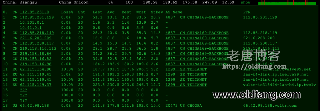 ---------------------------------------------------------------------- 重庆联通 traceroute to 113.207.25.138 (113.207.25.138), 30 hops max, 32 byte packets 1 * 2 * 3 * 4 * 5 et-0-0-61.cr3-lax2.ip4.gtt.net (76.74.41.89) 21.50 ms AS286,AS3257 United States, California, Los Angeles, gtt.net 6 ae2.cr5-sjc1.ip4.gtt.net (89.149.180.26) 7.13 ms AS286,AS3257 United States, California, San Jose, gtt.net 7 219.158.39.101 179.78 ms AS4837 United States, California, San Jose, ChinaUnicom 8 219.158.116.249 166.76 ms AS4837 China, Shanghai, ChinaUnicom 9 219.158.8.189 165.28 ms AS4837 China, Guangdong, Guangzhou, ChinaUnicom 10 219.158.7.133 166.17 ms AS4837 China, Shanghai, ChinaUnicom 11 219.158.106.254 176.02 ms AS4837 China, Chongqing, ChinaUnicom 12 113.207.25.138 172.22 ms AS4837 China, Chongqing, ChinaUnicom ---------------------------------------------------------------------- 成都联通 traceroute to 119.6.6.6 (119.6.6.6), 30 hops max, 32 byte packets 1 * 2 * 3 * 4 * 5 las-b4-link.ip.twelve99.net (62.115.149.36) 0.40 ms AS1299 United States, California, Los Angeles, telia.com 6 ae2.cr5-sjc1.ip4.gtt.net (89.149.180.26) 9.41 ms AS286,AS3257 United States, California, San Jose, gtt.net 7 as4837.sjc10.ip4.gtt.net (173.205.62.82) 161.04 ms AS286,AS3257 United States, California, San Jose, gtt.net 8 219.158.6.5 202.74 ms AS4837 China, Beijing, ChinaUnicom 9 219.158.113.118 193.92 ms AS4837 China, Shanghai, ChinaUnicom 10 219.158.16.81 164.17 ms AS4837 China, Beijing, ChinaUnicom 11 * 12 * 13 119.6.197.174 201.00 ms AS4837 China, Sichuan, Chengdu, ChinaUnicom 14 119.6.6.6 215.64 ms AS4837 China, Sichuan, Chengdu, ChinaUnicom ----------------------------------------------------------------------