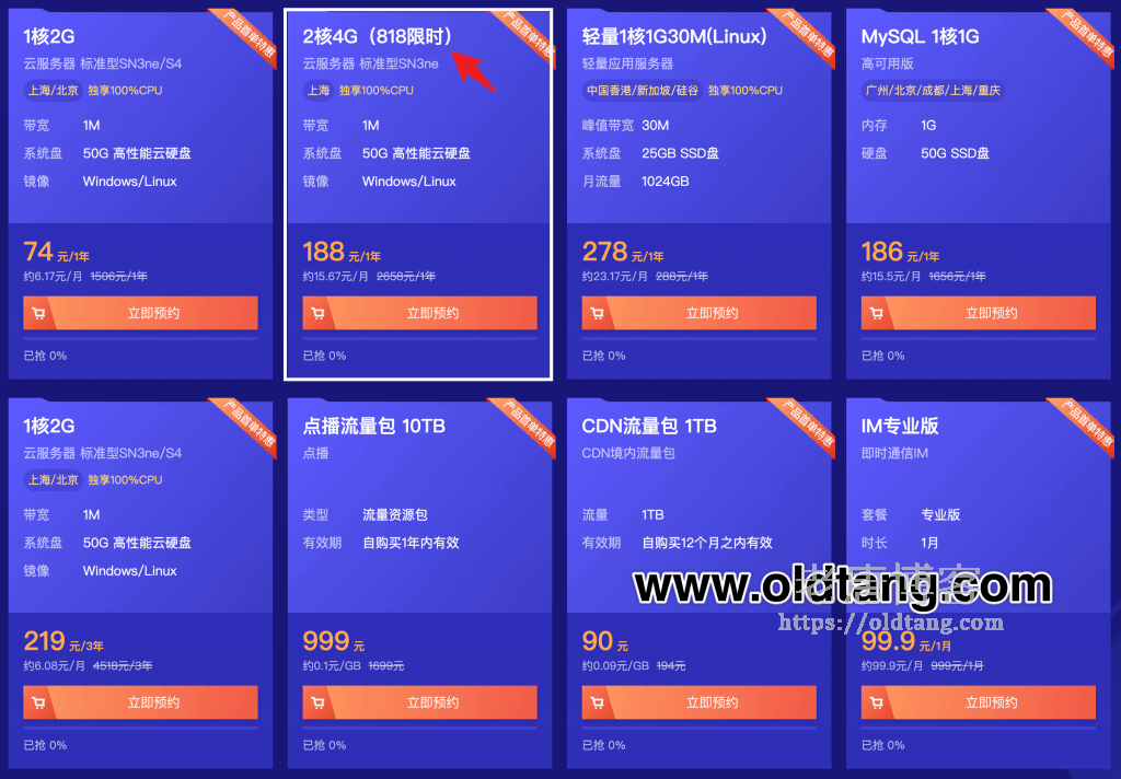 腾讯云 818 限时秒杀活动,首单限时秒杀,最低仅需 74 元/年,如果愿意加点钱,就可以花 188 元买到 2核 4G 的配置,并且是独享 CPU 性能的,非常划算。当然,续费价格可能比较贵,如果我们想要长期使用,建议可以看看腾讯云轻量无忧套餐,续费同价,并且价格也是超值的,参考《腾讯云轻量无忧计划 Lighthouse Care:新老同价/续费同价/免费域名》。总之腾讯云各方面都是性价比的代言词,良心云毕竟不是吹的。