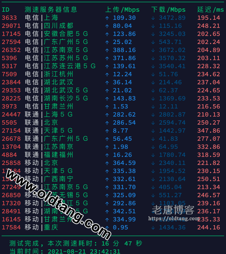 下面是 Vultr 芝加哥机房的速度测试结果,目前看只有移动线路速度比较快,电信和联通都是比较慢的。