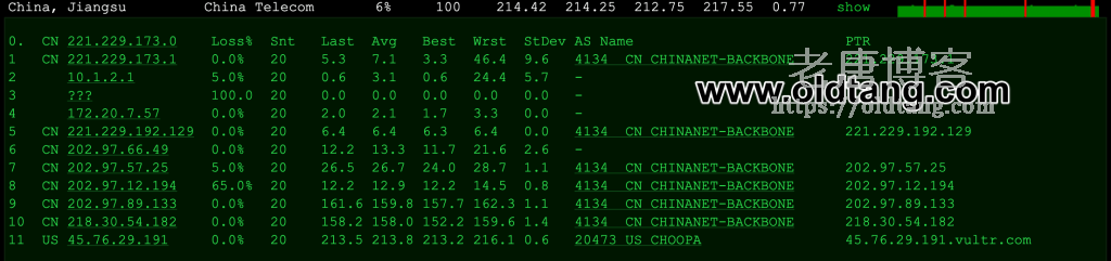 ---------------------------------------------------------------------- 上海移动 traceroute to 120.204.197.126 (120.204.197.126), 30 hops max, 32 byte packets 1 * 2 * 3 * 4 * 5 xe-0-0-45-1.a01.chcgil09.us.bb.gin.ntt.net (129.250.207.213) 2.04 ms AS2914 United States, Illinois, Chicago, ntt.com 6 ae-8.r22.chcgil09.us.bb.gin.ntt.net (129.250.5.95) 1.82 ms AS2914 United States, Illinois, Chicago, ntt.com 7 ae-7.r25.sttlwa01.us.bb.gin.ntt.net (129.250.3.42) 43.32 ms AS2914 United States, Washington, Seattle, ntt.com 8 ae-1.r24.sttlwa01.us.bb.gin.ntt.net (129.250.3.82) 44.73 ms AS2914 United States, Washington, Seattle, ntt.com 9 ae-13.r30.tokyjp05.jp.bb.gin.ntt.net (129.250.4.143) 132.19 ms AS2914 Japan, Tokyo, ntt.com 10 ae-2.r26.tkokhk01.hk.bb.gin.ntt.net (129.250.2.51) 178.47 ms AS2914 China, Hong Kong, ntt.com 11 ae-0.a02.tkokhk01.hk.bb.gin.ntt.net (129.250.5.33) 179.18 ms AS2914 China, Hong Kong, ntt.com 12 * 13 * 14 * 15 * 16 * 17 * 18 * 19 * 20 * 21 * 22 * 23 * 24 * 25 120.204.197.126 210.87 ms AS9808 China, Shanghai, ChinaMobile ---------------------------------------------------------------------- 成都移动 traceroute to 183.221.253.100 (183.221.253.100), 30 hops max, 32 byte packets 1 * 2 * 3 * 4 * 5 xe-0-0-45-1.a01.chcgil09.us.bb.gin.ntt.net (129.250.207.213) 1.21 ms AS2914 United States, Illinois, Chicago, ntt.com 6 ae-8.r22.chcgil09.us.bb.gin.ntt.net (129.250.5.95) 1.46 ms AS2914 United States, Illinois, Chicago, ntt.com 7 ae-7.r25.sttlwa01.us.bb.gin.ntt.net (129.250.3.42) 51.28 ms AS2914 United States, Washington, Seattle, ntt.com 8 ae-1.r24.sttlwa01.us.bb.gin.ntt.net (129.250.3.82) 44.63 ms AS2914 United States, Washington, Seattle, ntt.com 9 ae-13.r30.tokyjp05.jp.bb.gin.ntt.net (129.250.4.143) 131.67 ms AS2914 Japan, Tokyo, ntt.com 10 ae-2.r26.tkokhk01.hk.bb.gin.ntt.net (129.250.2.51) 188.98 ms AS2914 China, Hong Kong, ntt.com 11 ae-0.a02.tkokhk01.hk.bb.gin.ntt.net (129.250.5.33) 183.71 ms AS2914 China, Hong Kong, ntt.com 12 * 13 223.120.2.53 182.99 ms AS58453 China, Hong Kong, ChinaMobile 14 * 15 * 16 221.183.25.122 187.57 ms AS9808 China, Guangdong, Guangzhou, ChinaMobile 17 * 18 * 19 * 20 * 21 * 22 183.221.253.100 228.98 ms AS9808 China, Sichuan, Chengdu, ChinaMobile ----------------------------------------------------------------------