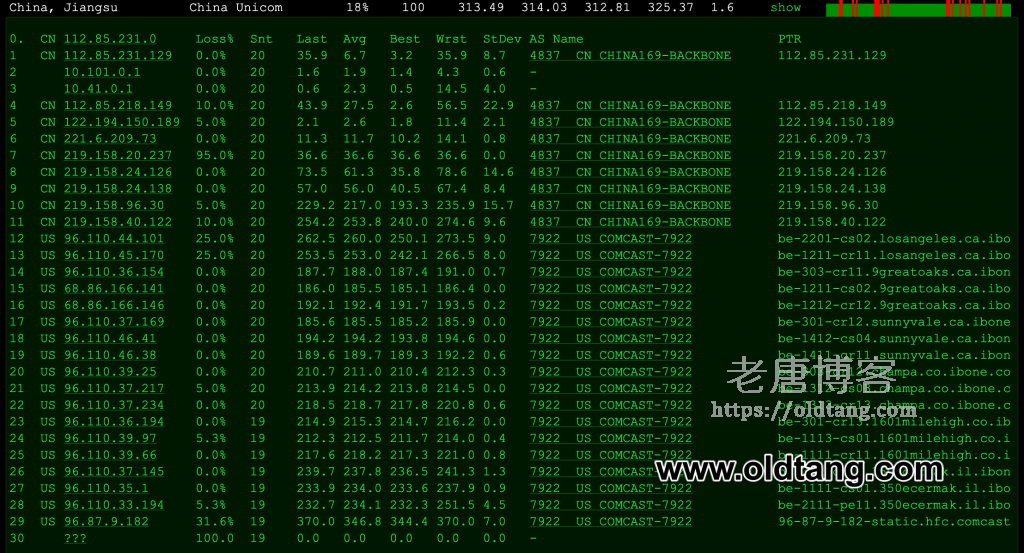 看路由跟踪才是知其然,知其所以然的环节。电信路由还比较正常,联通和移动路由不知道为什么有那么多跳。