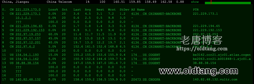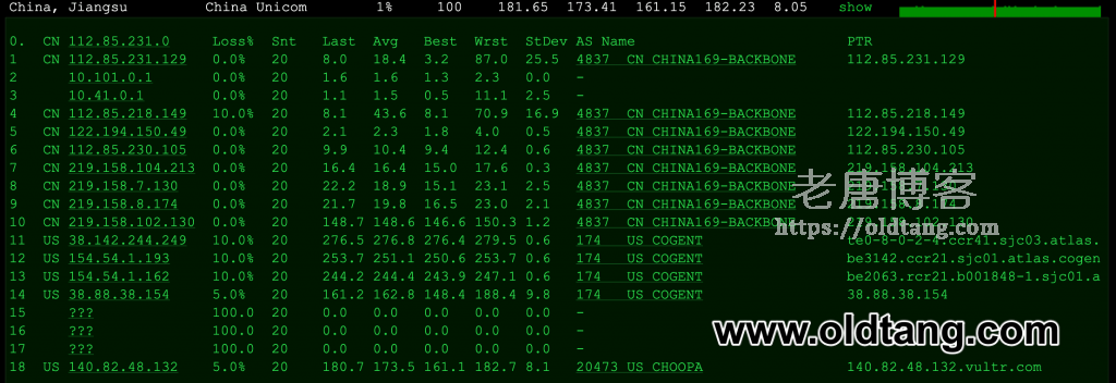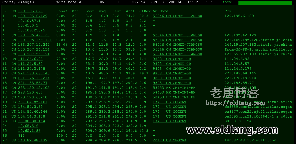---------------------------------------------------------------------- 上海移动 traceroute to 120.204.197.126 (120.204.197.126), 30 hops max, 32 byte packets 1 * 2 45.32.143.193 15.77 ms AS20473 United States, California, San Jose, choopa.com 3 * 4 * 5 xe-0-0-14-2.a00.snjsca04.us.bb.gin.ntt.net (129.250.207.197) 1.11 ms AS2914 United States, California, San Jose, ntt.com 6 ae-7.r25.snjsca04.us.bb.gin.ntt.net (129.250.3.59) 5.75 ms AS2914 United States, California, San Jose, ntt.com 7 ae-5.r24.snjsca04.us.bb.gin.ntt.net (129.250.3.146) 1.67 ms AS2914 United States, California, San Jose, ntt.com 8 ae-5.r26.osakjp02.jp.bb.gin.ntt.net (129.250.2.119) 105.17 ms AS2914 Japan, Osaka, ntt.com 9 ae-4.r27.tkokhk01.hk.bb.gin.ntt.net (129.250.2.43) 150.48 ms AS2914 China, Hong Kong, ntt.com 10 ae-0.r26.tkokhk01.hk.bb.gin.ntt.net (129.250.5.28) 154.56 ms AS2914 China, Hong Kong, ntt.com 11 ae-0.a02.tkokhk01.hk.bb.gin.ntt.net (129.250.5.33) 149.63 ms AS2914 China, Hong Kong, ntt.com 12 * 13 * 14 * 15 * 16 221.183.55.30 187.22 ms AS9808 China, Shanghai, ChinaMobile 17 * 18 221.176.22.29 179.83 ms AS9808 China, Shanghai, ChinaMobile 19 * 20 * 21 * 22 * 23 * 24 * 25 * 26 * 27 * 28 * 29 120.204.197.126 186.69 ms AS9808 China, Shanghai, ChinaMobile ---------------------------------------------------------------------- 成都移动 traceroute to 183.221.253.100 (183.221.253.100), 30 hops max, 32 byte packets 1 * 2 45.32.143.193 16.07 ms AS20473 United States, California, San Jose, choopa.com 3 * 4 * 5 be5160.rcr21.b001848-1.sjc01.atlas.cogentco.com (38.88.38.153) 0.73 ms AS174 United States, California, San Jose, cogentco.com 6 be2063.ccr21.sjc01.atlas.cogentco.com (154.54.1.161) 1.15 ms AS174 United States, California, San Jose, cogentco.com 7 be3142.ccr41.sjc03.atlas.cogentco.com (154.54.1.194) 2.11 ms AS174 United States, California, San Jose, cogentco.com 8 38.88.224.162 2.00 ms AS174 United States, California, San Jose, cogentco.com 9 223.120.6.69 1.89 ms AS58453 United States, California, San Jose, ChinaMobile 10 223.120.12.30 159.58 ms AS58453 China, Hong Kong, ChinaMobile 11 221.183.55.54 161.03 ms AS9808 China, Guangdong, Guangzhou, ChinaMobile 12 221.176.19.197 163.99 ms AS9808 China, Guangdong, Guangzhou, ChinaMobile 13 221.176.24.5 159.29 ms AS9808 China, Guangdong, Guangzhou, ChinaMobile 14 111.24.5.173 180.44 ms AS9808 China, Guangdong, Guangzhou, ChinaMobile 15 111.24.3.169 192.99 ms AS9808 China, Beijing, ChinaMobile 16 221.176.21.202 195.85 ms AS9808 China, Beijing, ChinaMobile 17 * 18 183.221.253.100 193.27 ms AS9808 China, Sichuan, Chengdu, ChinaMobile ----------------------------------------------------------------------