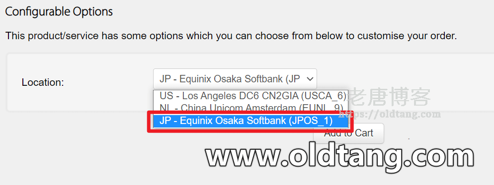 搬瓦工日本软银 JPOS_1 机房,购买的时候可以看到叫做 JP – Equinix Osaka Softbank (JPOS_1),是在搬瓦工 CN2 GIA-E 套餐里可以选择。如图所示,购买的时候就可以选择。